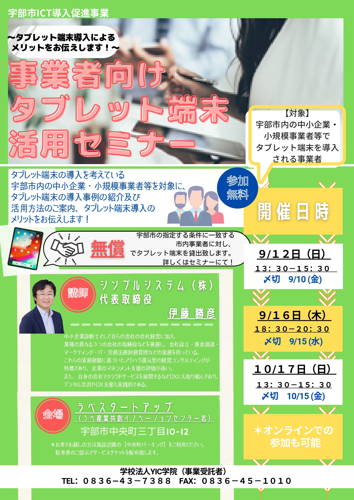 【宇部市*事業者向けタブレット端末活用セミナー】 ~タブレット端末導入によるメリットをお伝えします!~ タブレット端末の導入を考えている 宇部市内の中小企業・小規模事業者等を対象に、 タブレット端末の導入事例の紹介及び活用方法のご案内、 タブレット端末導入のメリットをお伝えします! ……