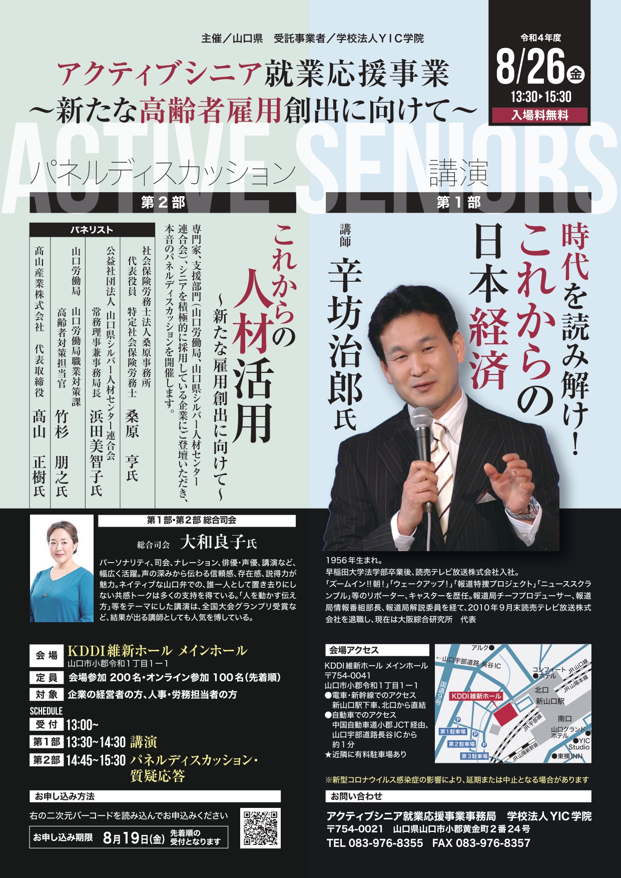 下関市アクティブシニア就業支援事業 「人材マネジメント事業」 主催/下関市(産業立地・就業支援課) 事業受託者/学校法人YIC学院 少子高齢化が進み働き手の不足が懸念される中、貴重な労働力となるシニア人材をいかに活用していくかが、企業にとって重要な課題となっています。そこで、シニア人材の採用や活用について、専門家を招いてワークショップを開催いたします。シニア人材の可能性に……