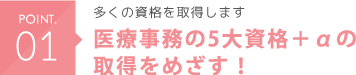 YICの医療ビジネスコースは医療事務系の「医療事務(医科)」、「医療事務(歯科)」、「調剤薬局事務」、「介護事務」、「ドクターズクラーク」の5大資格のほか、病院における接客能力を養う資格の「ホスピタリティコンシェルジュ」や医療事務系資格の中で唯一厚生労働省が認証した団体が行う「診療報酬請求事務」の取得をめざします。