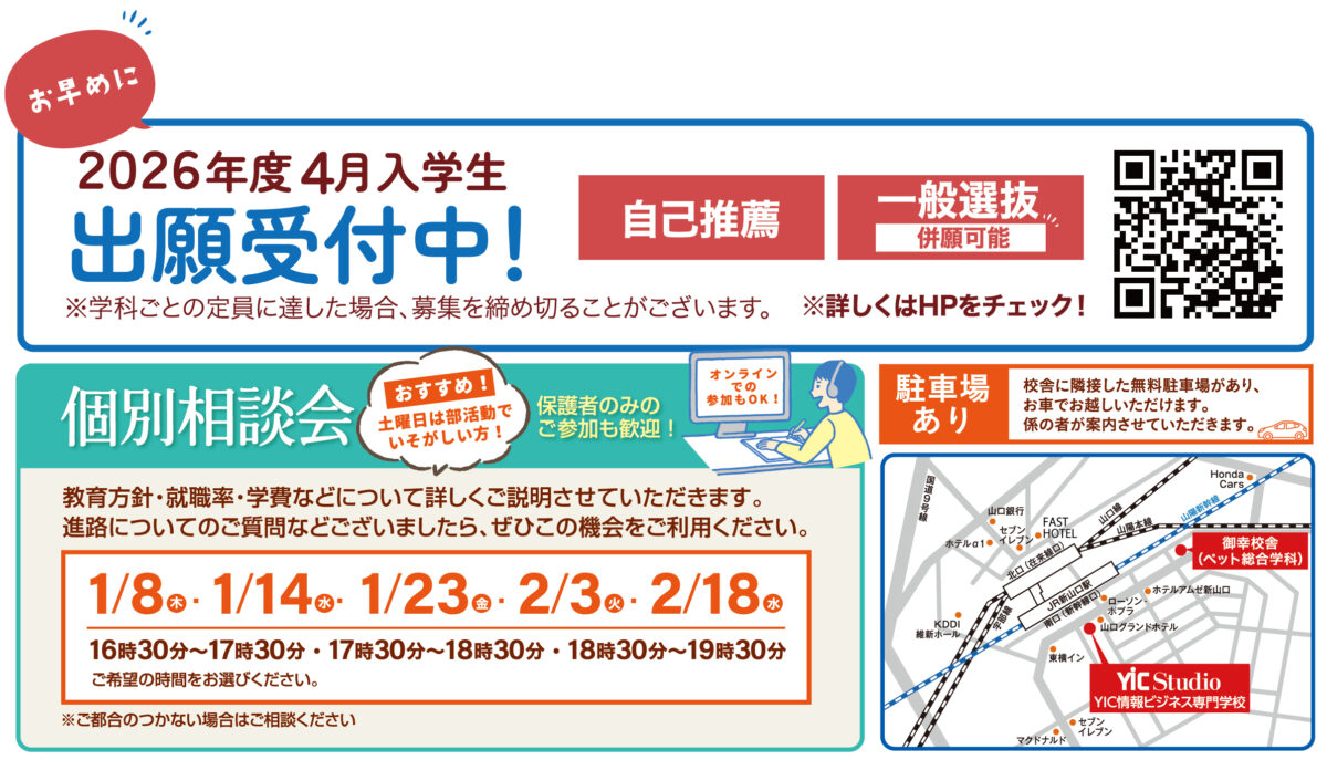 進路を考えている高校1年生・2年生・3年生、 保護者・社会人の方も大歓迎です!! 個別相談に応じます。お気軽にご参加ください。