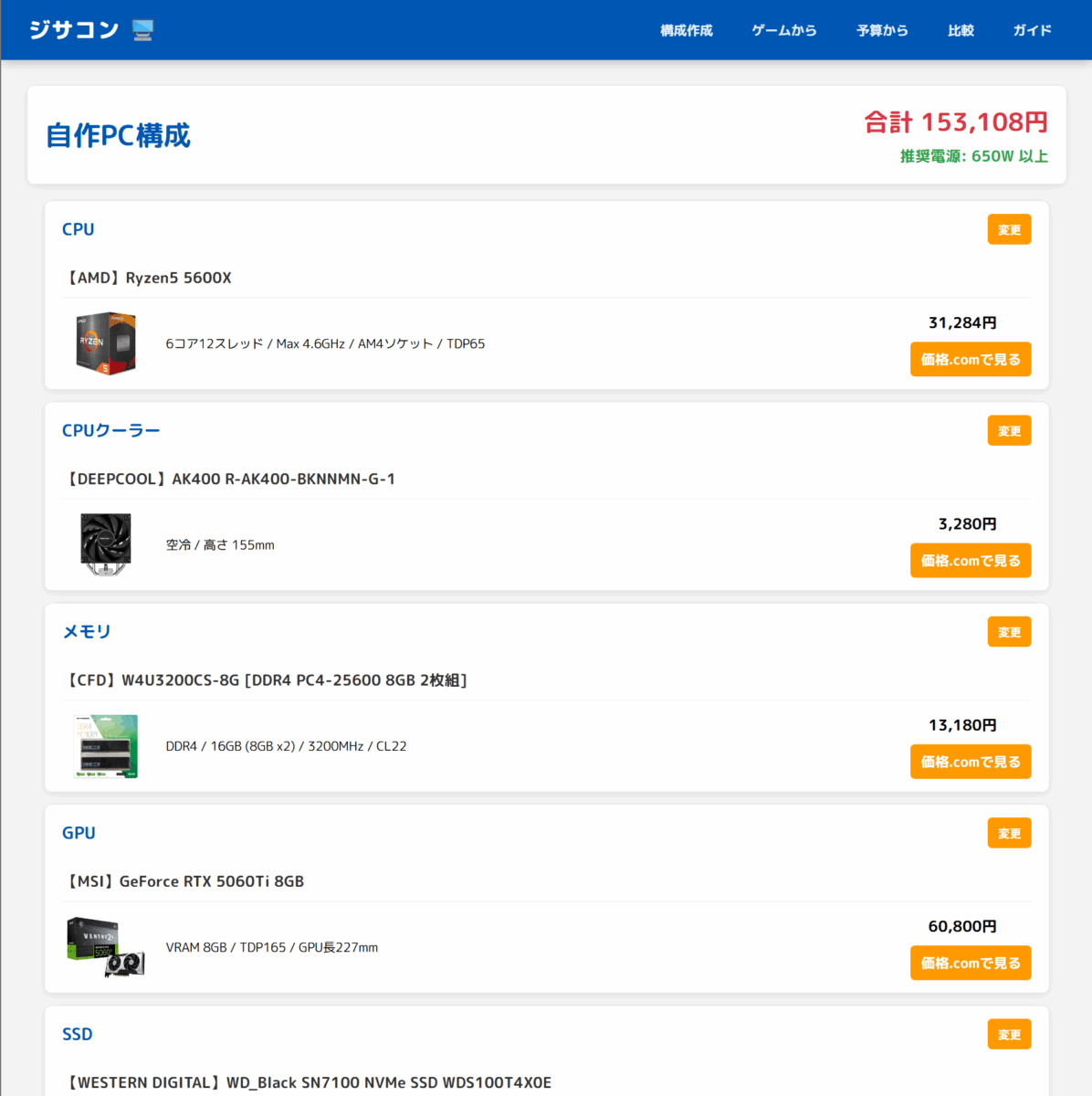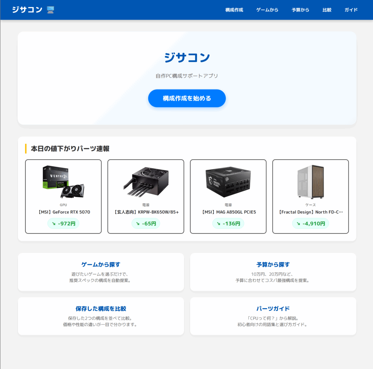「ジサコン」は、パソコンの詳しい知識がなくても、自分だけのパソコン作りを失敗せずに楽しめるサポートアプリです。「遊びたいゲーム」や「予算」を選ぶだけで、必要なパーツをすべて自動で提案してくれます。パーツの規格が合わなくて使えない!といった失敗を自動で防ぐ機能や、今が買い時なのかひと目でわかるグラフ機能を搭載。難しいことを考えずに、賢くお得に、理想のパソコンを組み立てることができます。