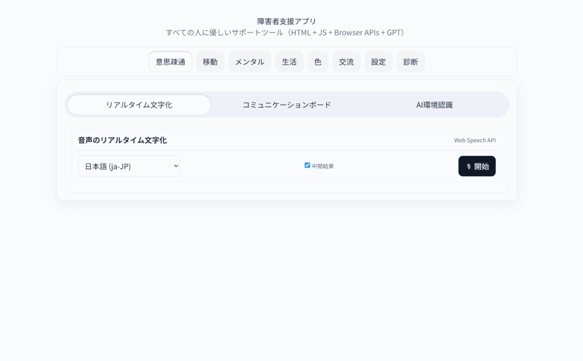 本アプリはサポートが必要な方向けのお助けアプリです。主な機能は8つのカテゴリに分かれています。まず「意思疎通」では、音声のリアルタイム文字化、会話ボード、AI環境認識を提供。「移動」では、GPS音声ナビゲーションとバリアフリー施設検索で外出をサポートします。「メンタル」パネルには、優しい会話スタイルで対話できるgeminiAPIのケアチャットを搭載。さらに、「色」カテゴリでは画像を認識しグリッドで表示して指定した色をカラーコードで表示します。さらに見えにくい色に対応した色覚シミュレーションを搭載しています。他にも色覚・聴覚などの「診断テスト」や、交流のための「コミュニティ掲示板」機能も備えています。フォント設定や高コントラスト表示など、アクセシビリティへの配慮も徹底されています。