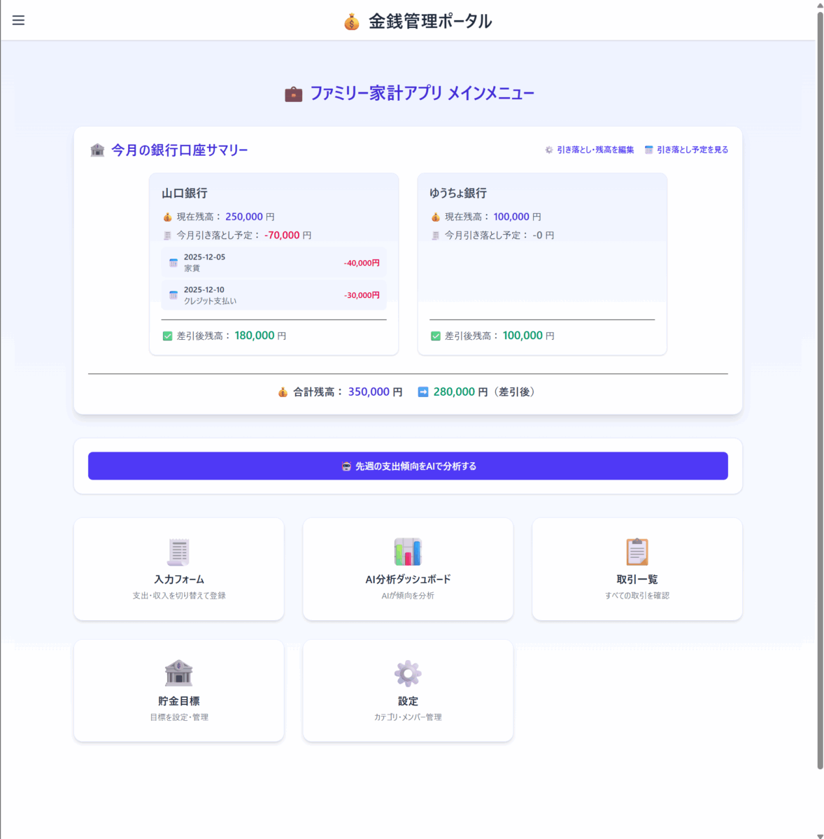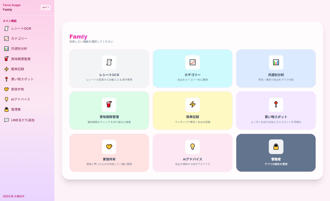 「Famly」は、日々の支出管理をもっと手軽に、家族みんなで楽しく使えるようにした家計アシスタントアプリです。レシート文字起こしによる自動入力やカテゴリ別の支出整理、月・週ごとのグラフ分析といった基本機能に加え、食品の賞味期限を可視化し、残り物からAIが献立を提案する機能を備えています。また、利用頻度の高い店舗を分析して足跡マップとして表示したり、支出傾向をもとに節約ポイントをアドバイスしてくれるため日々の買い物を振り返る楽しさも生み出せます。日常生活の中に自然に溶け込み、家計管理をより簡単で楽しくすることを目指して作成したアプリです。