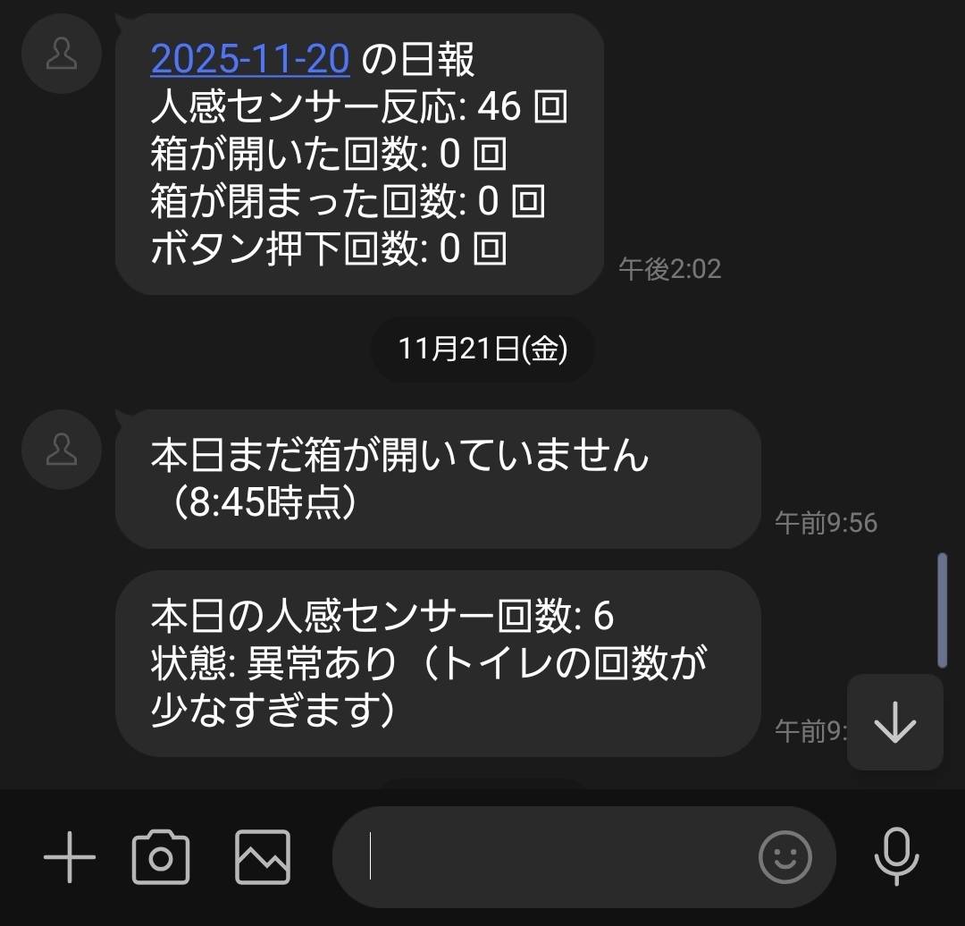 このアプリは一人暮らしの高齢者の生活を離れて暮らす家族が見守るためのアプリです。このアプリはRaspberry Pi とカメラ・各種センサーを組み合わせて、高齢者見守りや異常検知を自動化するシステムです。カメラ映像を6分ごとに撮影し、前回画像との比較と倒れ込み判定を行い、異常があればLINEへ写真付きで通知します。さらに、ボタン・人感センサー・磁気センサーの状態を常時監視し、箱の開閉や人の動きをデータベースに記録します。LINEからは「ログ」コマンドで今日の履歴や日付指定での検索ができます。また、活動量が普段より少なかったり体調不良の前兆などの生活リズムチェックも自動化。通知・記録・画像確認をすべてLINE上で完結できるシンプルで扱いやすい見守りシステムです。