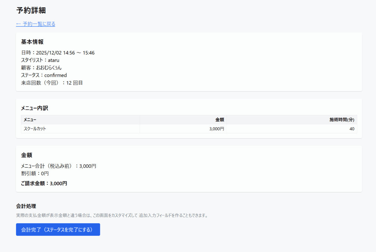 こだわったのは、直感的なUIと、予約状況のカレンダー形式での管理です。これにより、不慣れなスタッフでもスムーズに作業を進めることができ、日々の煩雑な事務作業を効率化することを目指します。