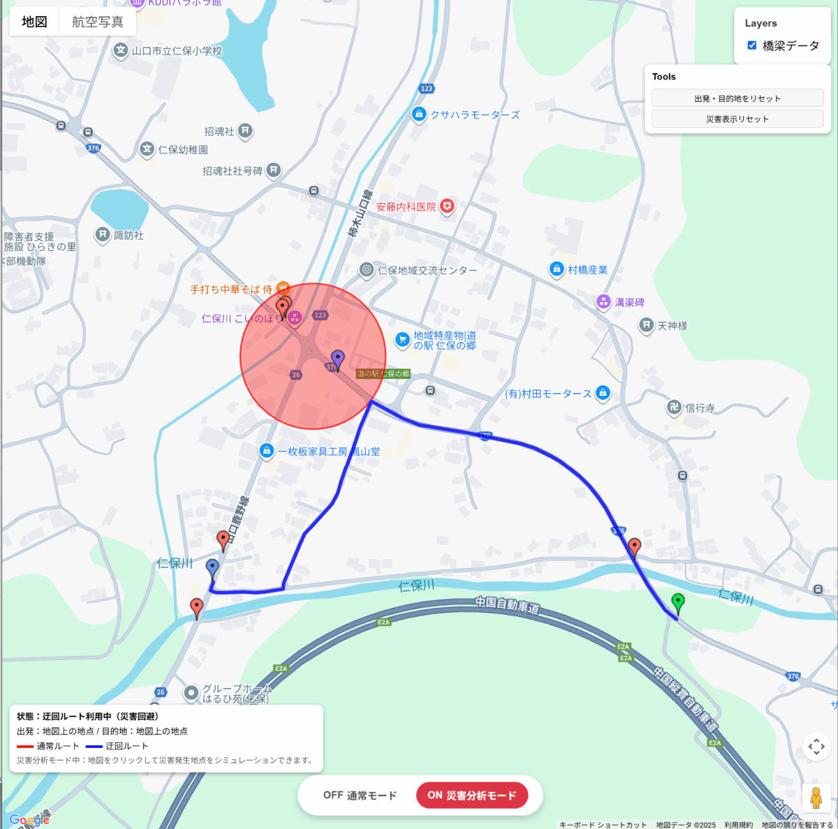 シミュレーション災害がマップ上に設定された場合、アプリが自動でその影響範囲を判別し、危険を避ける「安全な迂回ルート」を提示します。災害時に「どこを通れば安全?」と迷う時間を減らし、安心して移動できるようにすることが狙いです。また、橋の状態などの“ふだんは見えないインフラの状態”も地図と連動して確認できるため、企業や自治体のリスク管理にも役立ちます。
