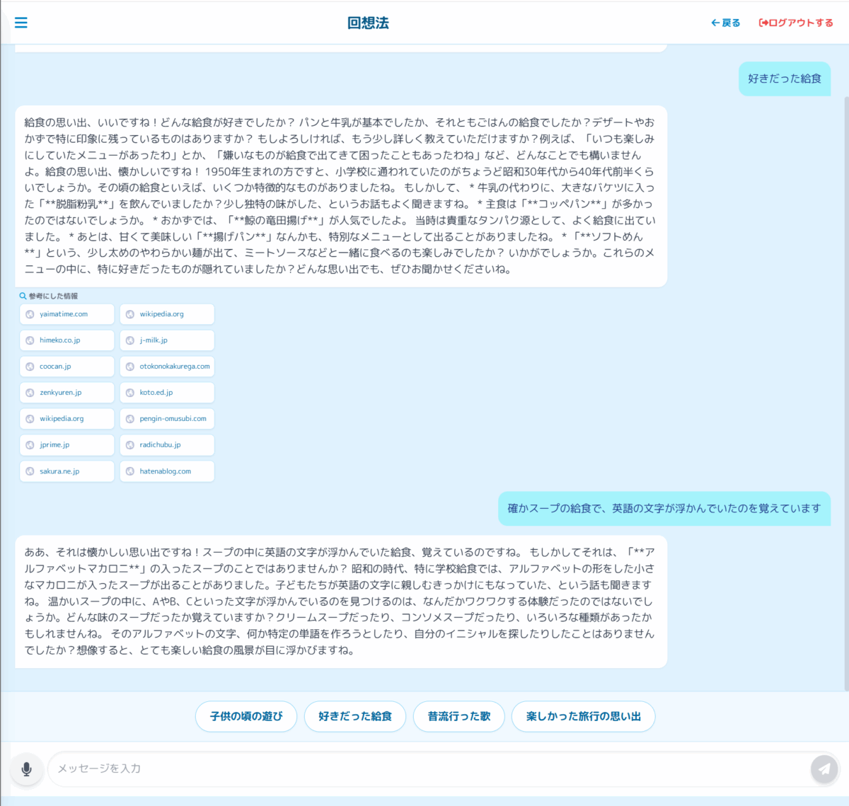 特に回想法と呼ばれる機能では、グラウンディング(Google検索を使った正確な情報の提供)を活用して、当時の流行や思い出を具体的に引き出すことで脳トレの効果を高めます。