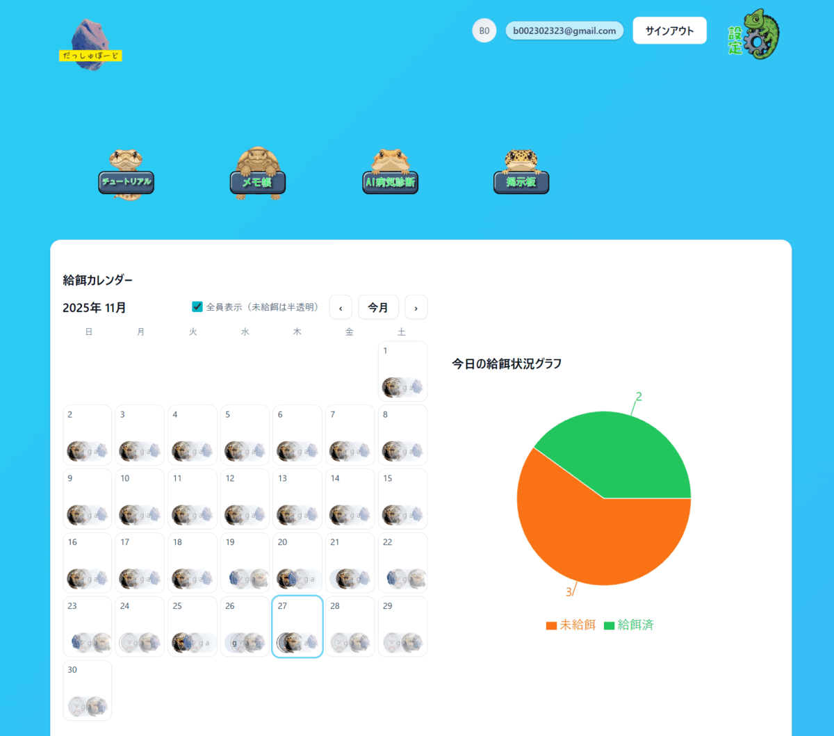 個体ごとの編集、記録の追加・更新・削除、並び替え、優先度メモも可能。ダッシュボードで全体を把握し、給餌カレンダーで漏れを防ぎます。