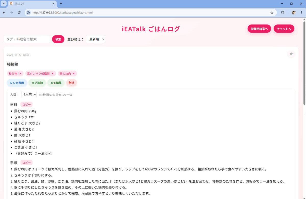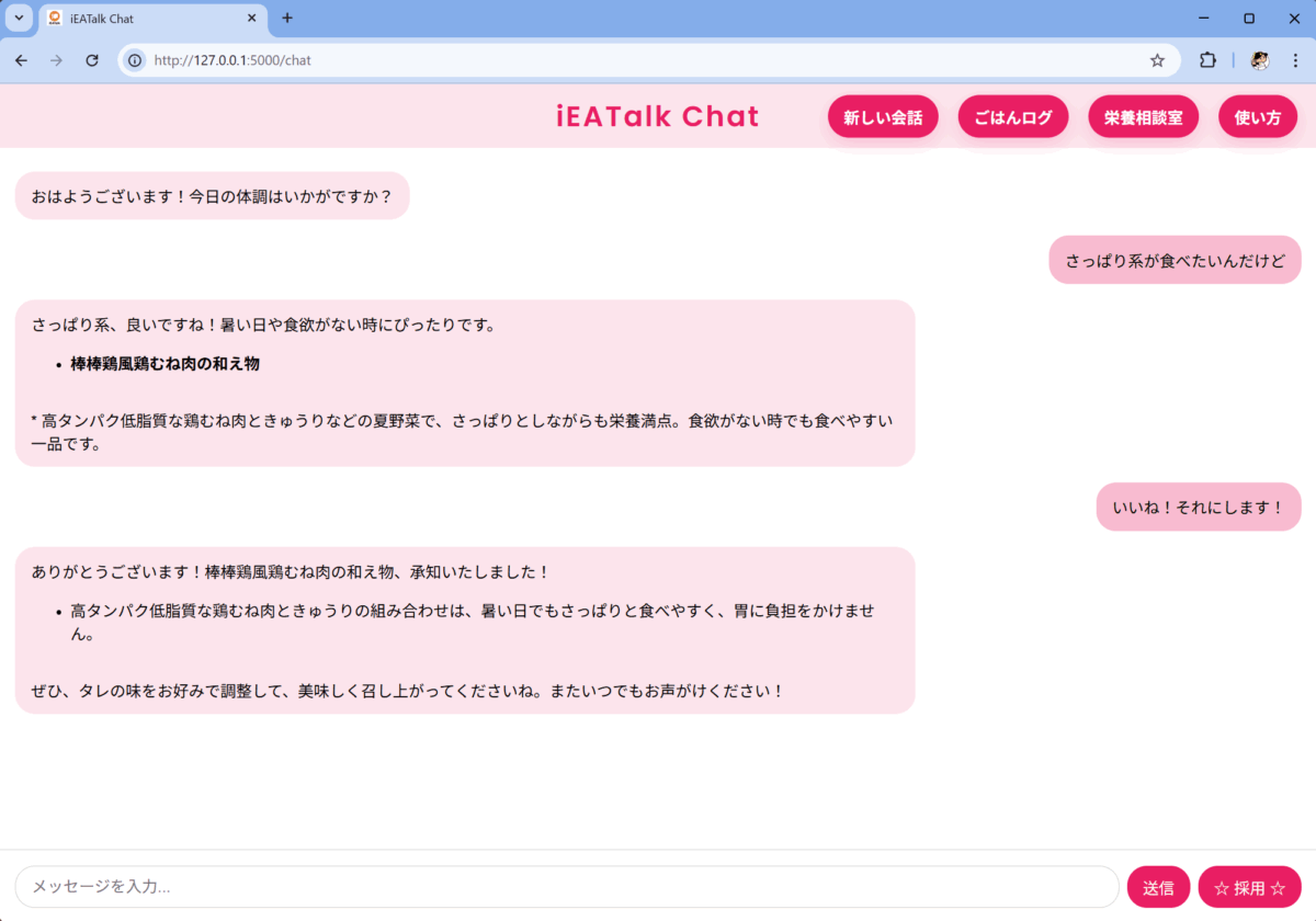 iEATalkは、体調や気分に合わせて料理を提案してくれる会話型アプリです。ユーザーが「今日は疲れた」「さっぱりしたものが食べたい」などと話しかけると、AIが料理名とその理由(栄養のポイント)を分かりやすく教えてくれます。また、提案された料理は“ごはんログ”で記録され、日々の食生活を振り返ることができます。