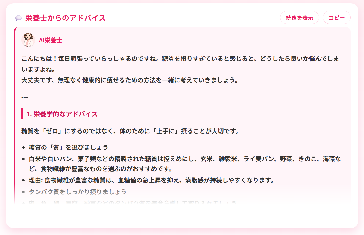 さらに「AI栄養士」では、食事の悩みや不足しがちな栄養素について相談すると、AIが優しくアドバイスとおすすめの献立を教えてくれます。忙しい家族の毎日の食事をサポートする、やさしい食のパートナーとなるアプリです。