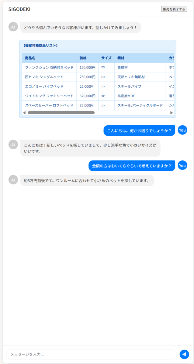 本アプリは、家具の販売を行っている母親の販売能力を向上させるためのアプリです。このアプリでは、ランダムに現れる顧客に対して、求められている家具をアプリ内のチャットを通じて販売するアプリです。独自の評価方法によって、接客が評価され、アドバイスがもらえるので、そのアドバイスを参考に成長することが出来るシステムとなっています。