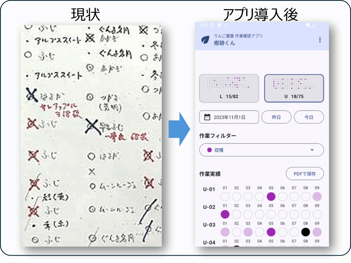「樹跡(きせき)くん」は、りんご園での作業をひと目で確認できるアプリです。