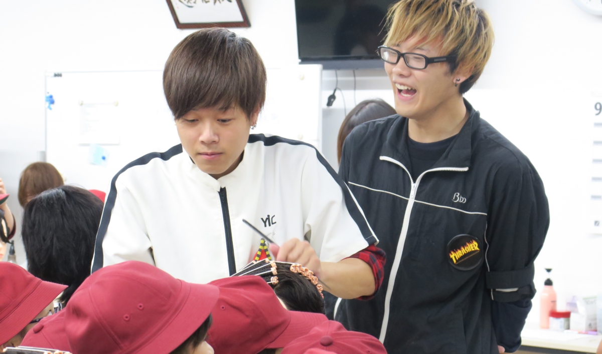 最後に、美容の実習室で学生の練習風景を間近で見ました。