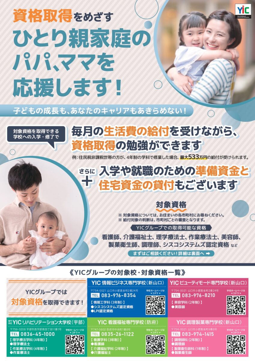 YICグループでは、ひとり親家庭の方が資格取得を通じて安定した就業をめざせるよう、公的支援制度に関する情報提供を行っています。