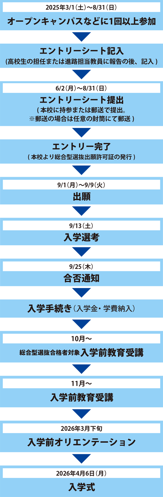 | エントリー条件 | 以下の①~⑤の条件をすべて満たす者 ① 高等学校を卒業した者および2026年3月卒業見込者または高等学校を卒業した者と同等以上の学力があると認められた者(学校教育法施行規則第150条各号に定めた者) ②所属高等学校の担任(または進路担当教員)の承認を得た者(高校生) ③2025年3月1日から8月31日までに開催される本校オープンキャンパスなどに1回以上参加した者 ④下記のいずれかの項目に該当する者(エントリーシートに記入) ・高等学校在学中、部活動を継続して行った者 ・生徒会活動経験者 ・積極的な社会貢献活動(ボランティア)を実施した者 ・1、2年次の登校率98%以上の者(例:200日登校のうち欠席が4日以下) ⑤本校を志望する理由が明確で、医療福祉に貢献したいなど強い意欲を有している者 |