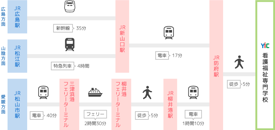 看護福祉専門学校には、いろいろな交通手段でアクセスすることができます。中四国地方の皆さまは、以下の例をご参考ください。