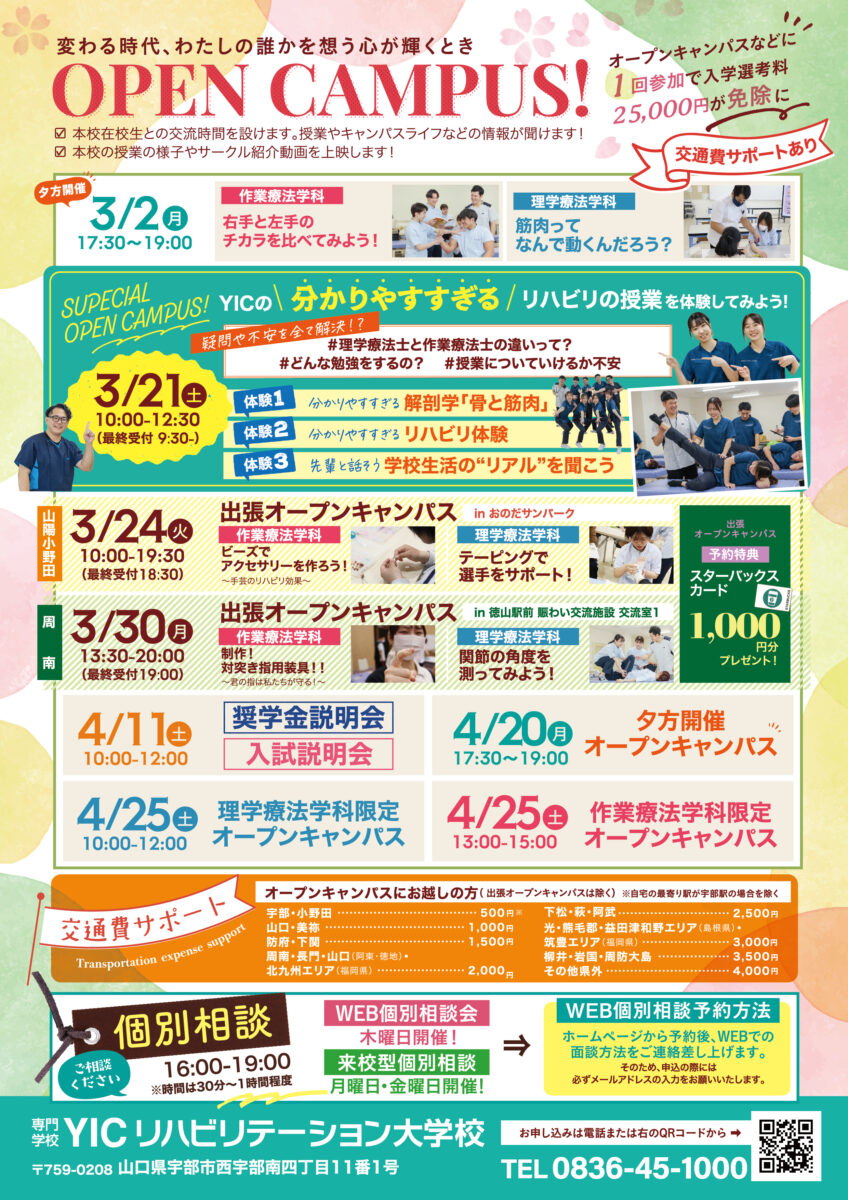 3・4月開催オープンキャンパスのご案内です🍀 安定の医療系! 開校以来、就職率100%✨ リハビリにご興味をお持ちの方、高校生の方、疑問にお答えします! 進路決定に向けて、どんどん動きましょう! オープンキャンパスの詳細はコチラ👇