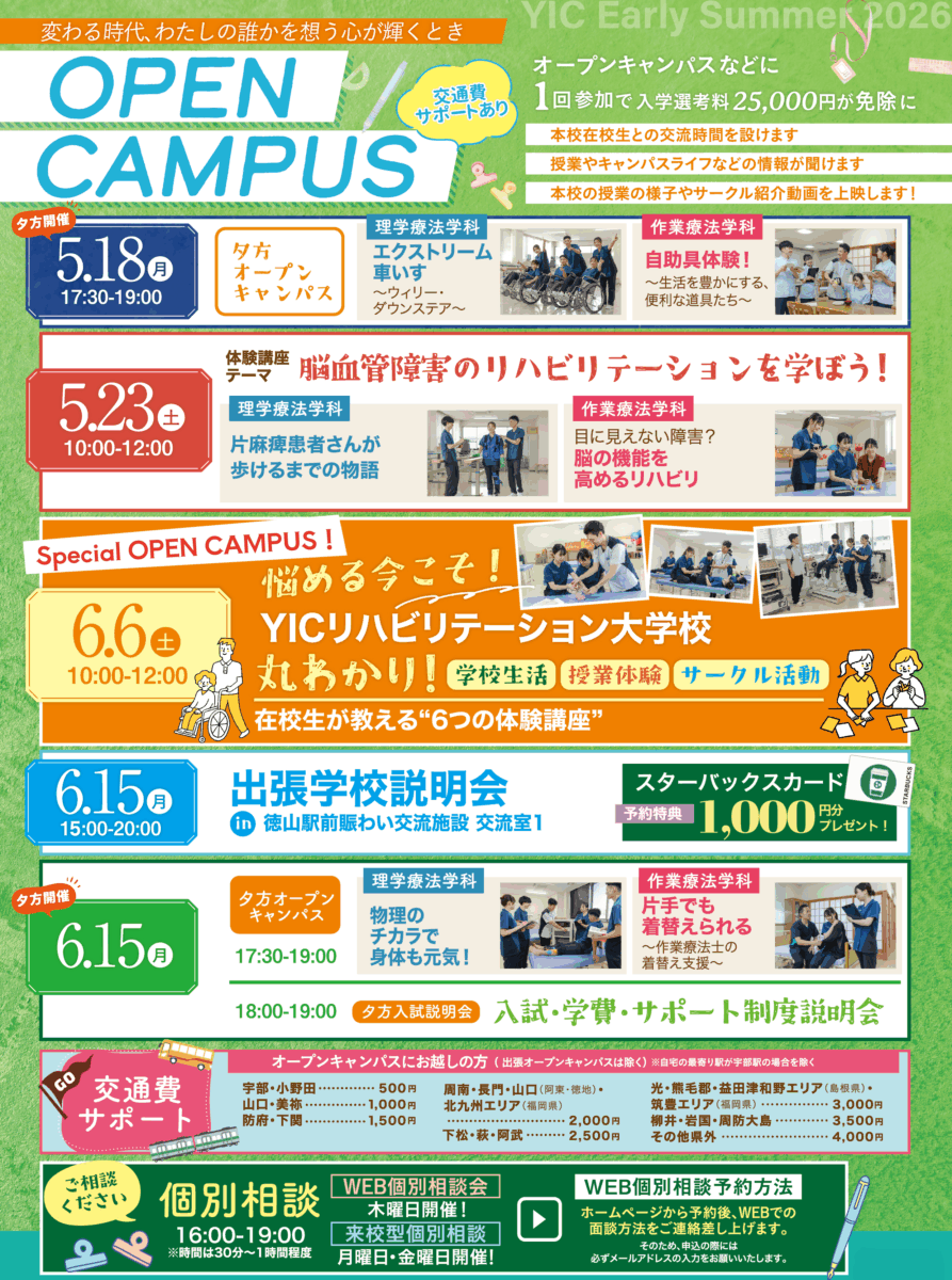 5・6月開催オープンキャンパスのご案内です🍀 安定の医療系! 開校以来、就職率100%✨ リハビリにご興味をお持ちの方、高校生の方、疑問にお答えします! 進路決定に向けて、どんどん動きましょう! オープンキャンパスの詳細はコチラ👇
