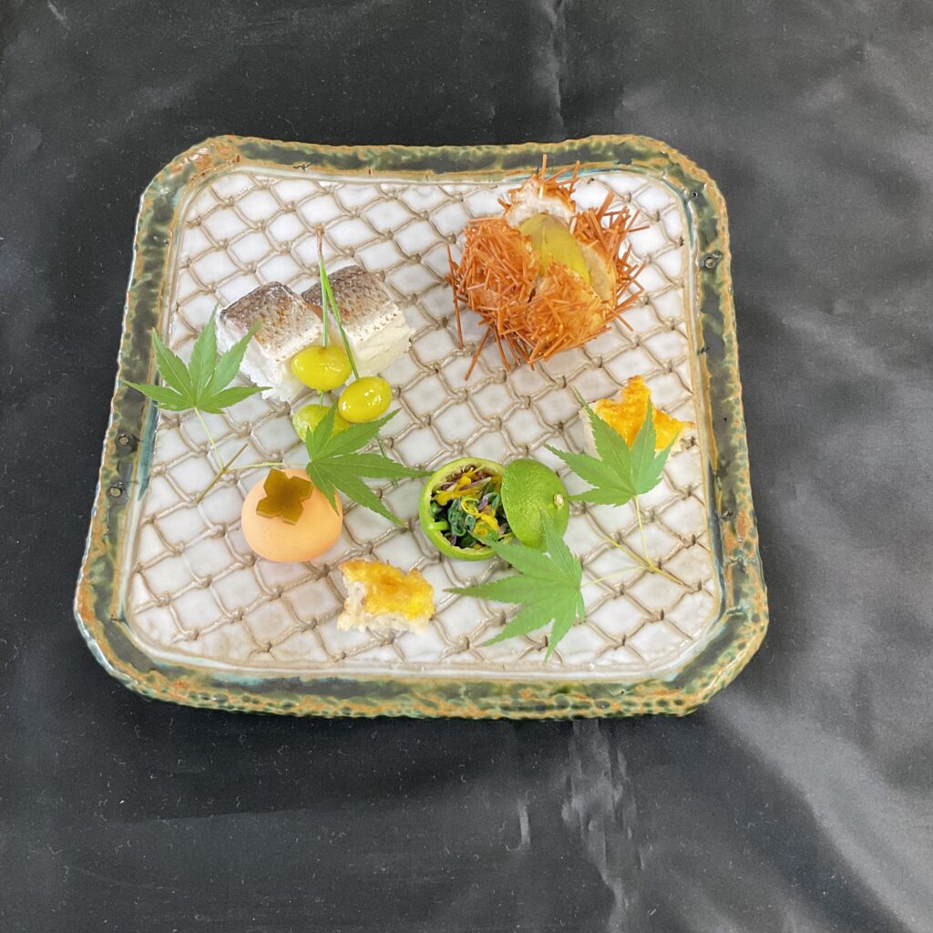 栗を蜜で甘く煮て、つくね芋柿見立てでは大和芋をすり潰し色を付けて柿に見立てるよう昆布で葉を作りました😊