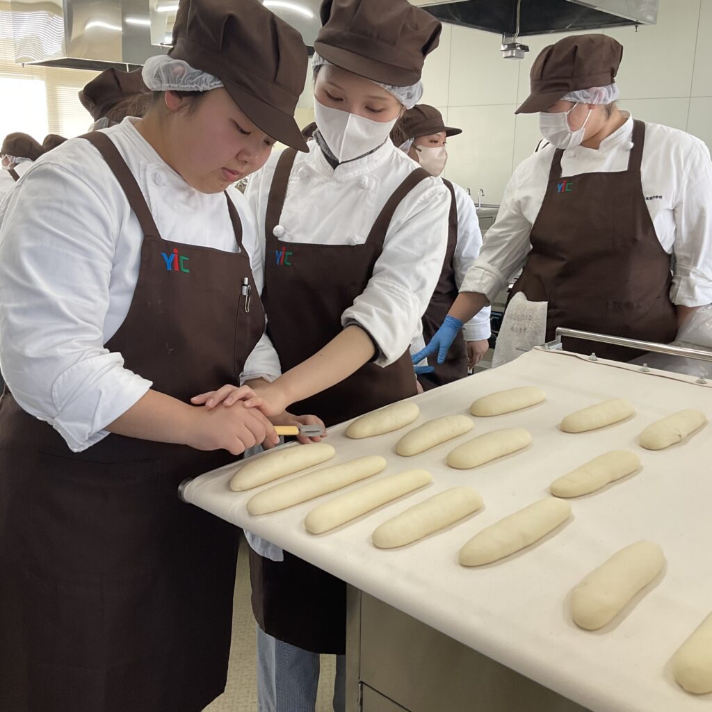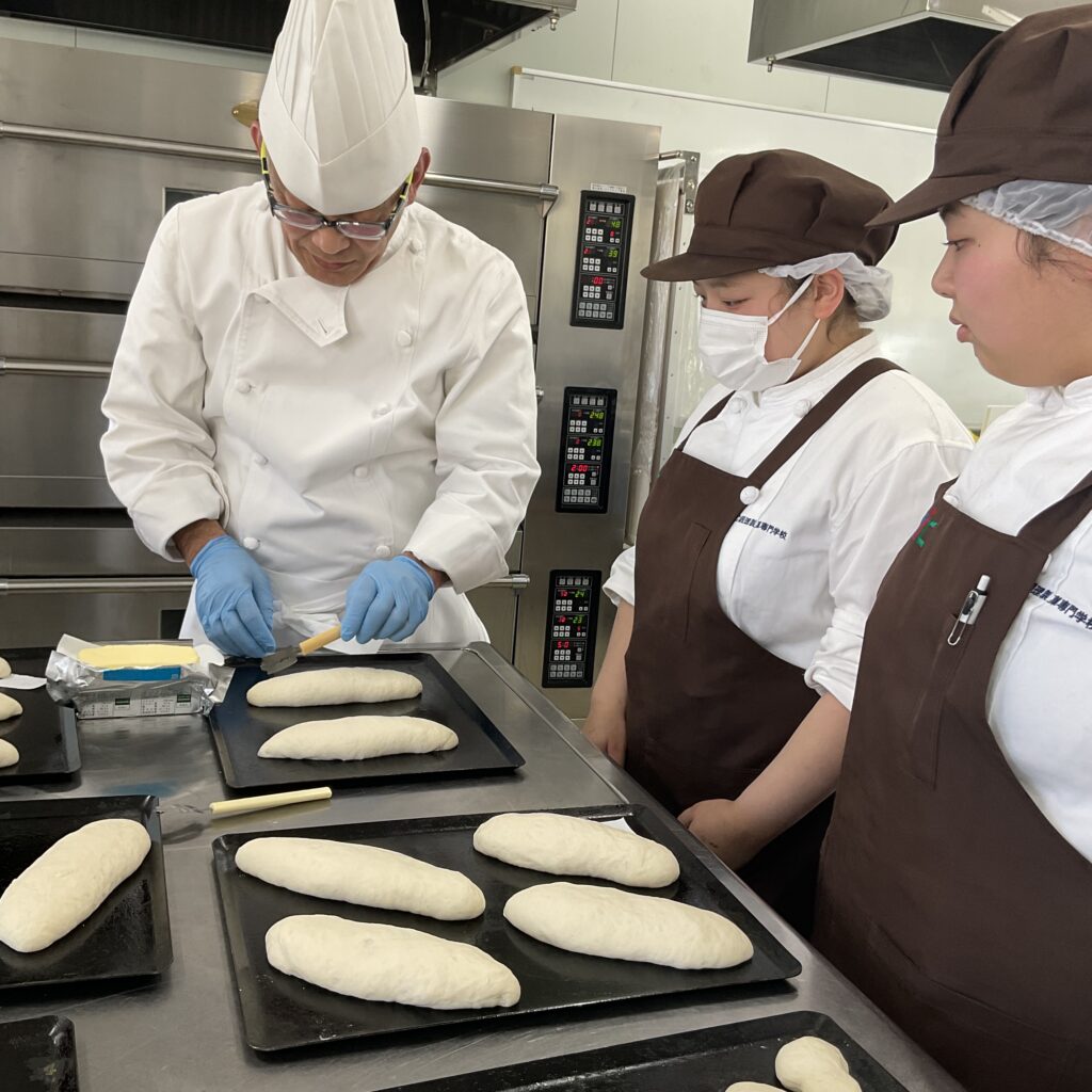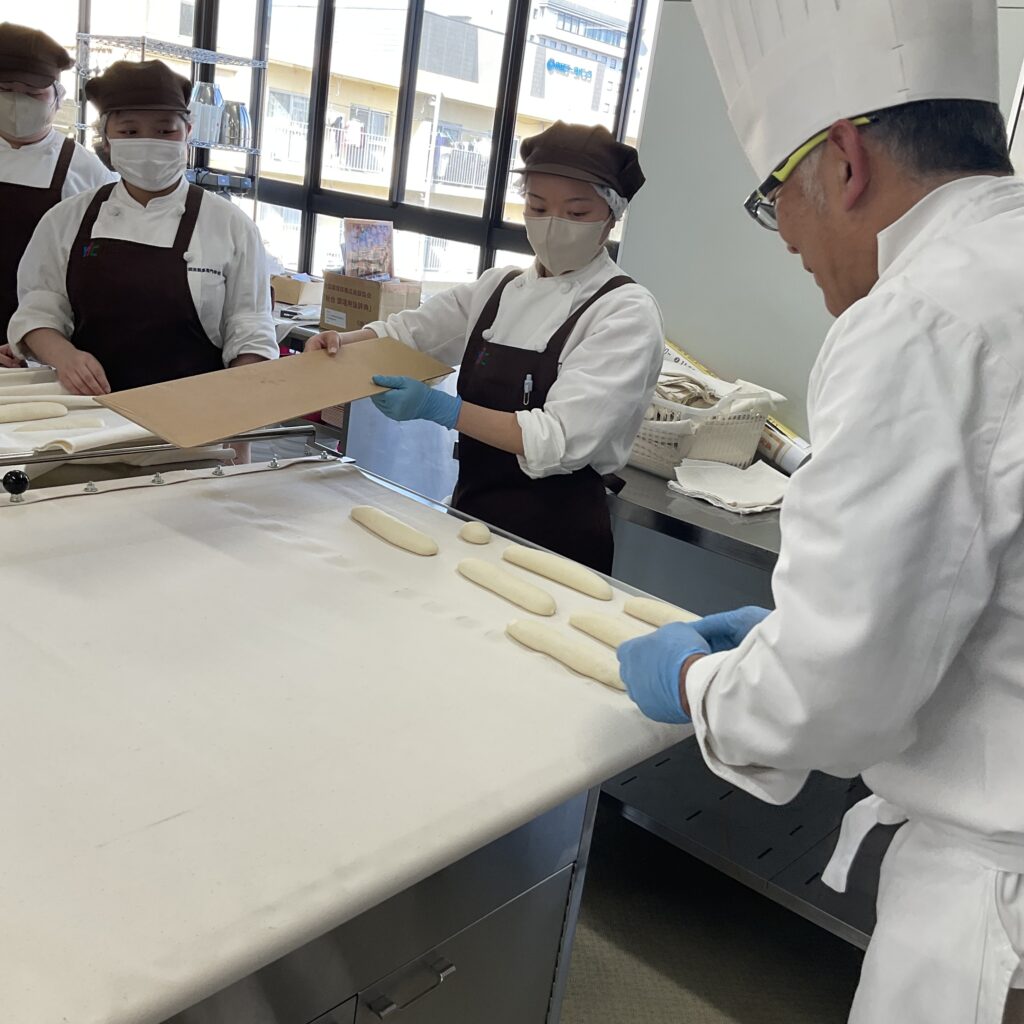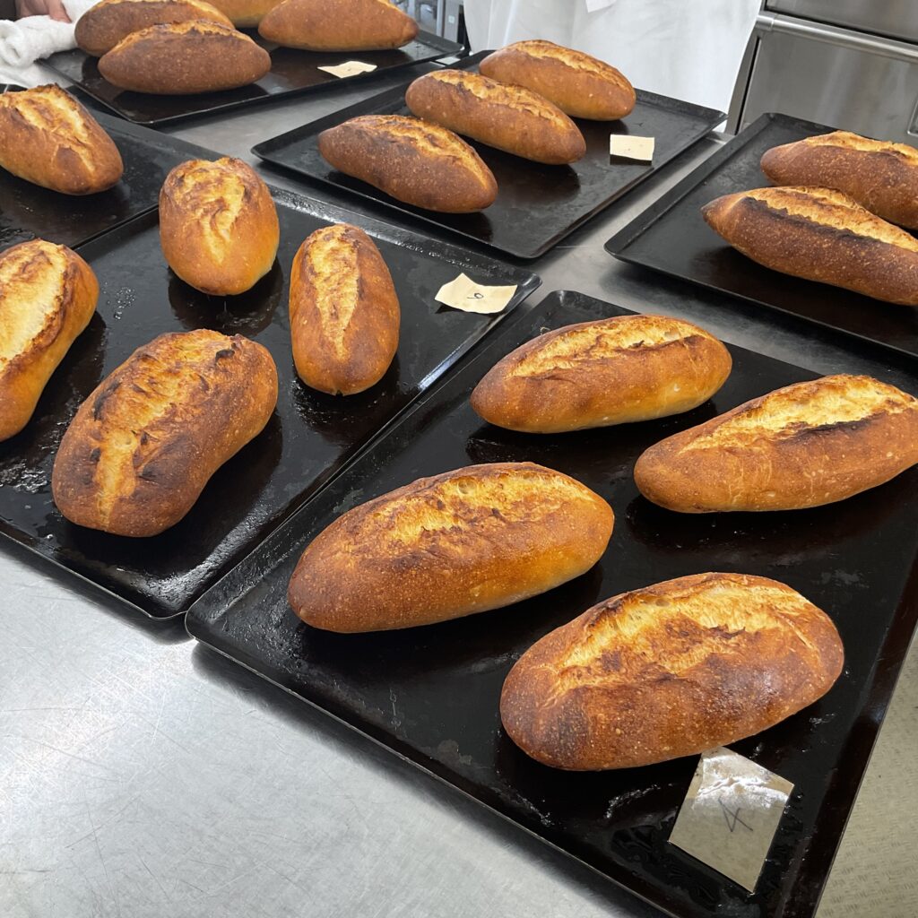 本日は山口県にある『ケァンベル』の安野先生にガーリックフランス🥖とミルクフランス🥖を教えていただきました。フランス粉、塩、水、酵母のみを使い、シンプルな食材で外はパリパリで香ばしく、中はもちもちです!材料がシンプルだからこそ職人技が重要ですね!実習も手早く出来るようになり、美味しい仕上がりました★