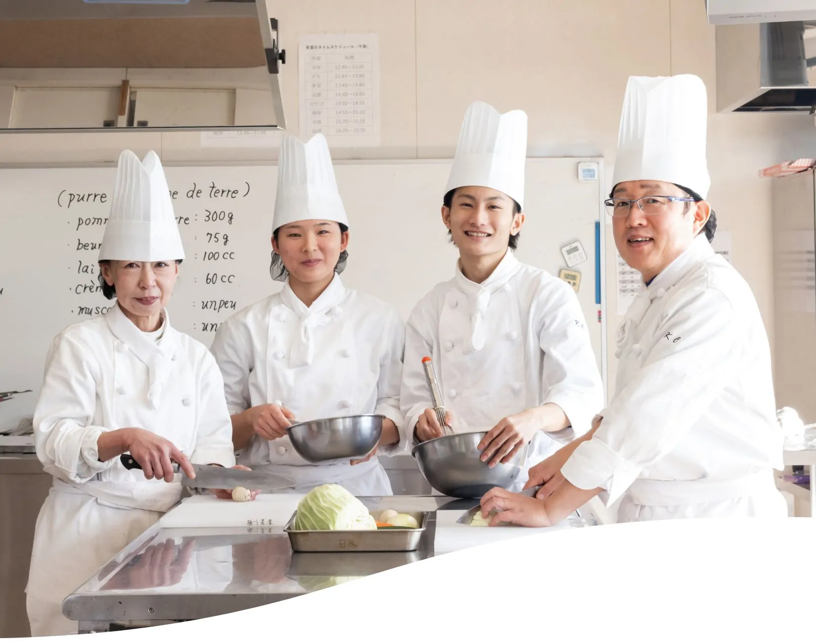ホテル、老舗料亭やオーナーシェフなど、一流の現場を知る講師陣を迎え、日本料理・西洋料理中国料理から製菓・製パンまで幅広い分野の技術を丁寧に直接指導します。